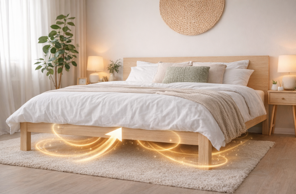 Para favorecer el flujo de Qi debemos evitar los obstáculos. Ahí donde se acumulan cosas el Qi se estanca y no fluye, y eso no queremos que ocurra justo debajo de donde pasamos muchas horas.