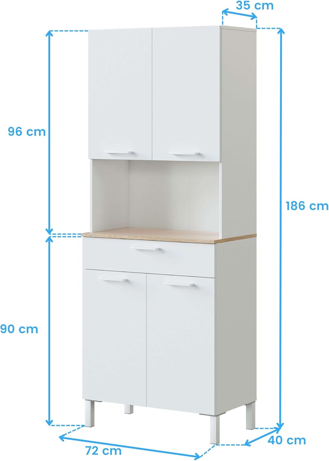 Este mueble auxiliar de cocina con despensa y hueco para microondas es una opción funcional y versátil para quienes buscan orden, capacidad y diseño en una sola pieza.