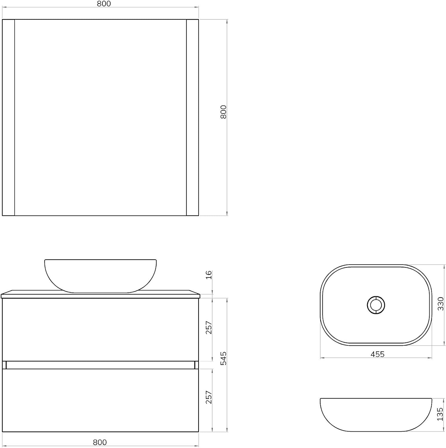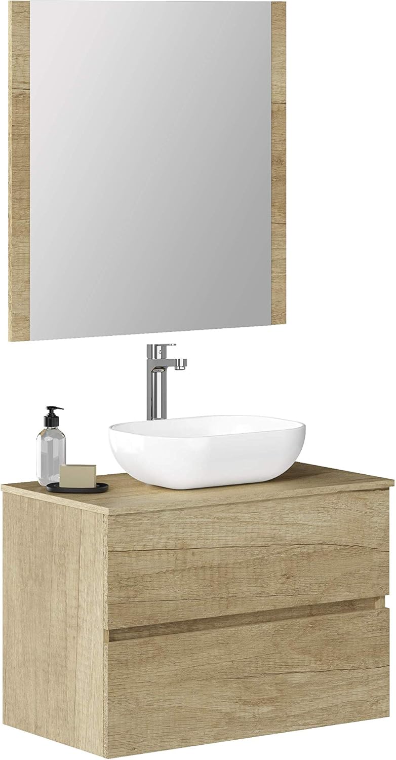 El conjunto se completa con un espejo de 80 cm con marco de madera, que amplía visualmente el espacio y refuerza la sensación de orden y armonía en el baño.